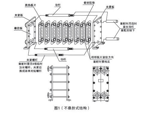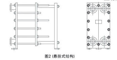 板式換熱器在裝配形式上又可分為不懸掛式(圖1)和懸掛式(圖2),不懸掛式換熱器不帶支柱,地腳板直接焊在二個夾緊板的下端,它適于重量較小的小型號的換熱器,以便在拆裝時能搬動。懸掛式換熱器帶有支柱,它拆裝時可在有所原位不動,活動夾緊板和換熱板片懸掛在上導(dǎo)桿上,可以移動,換熱板片可以拆下和裝上,較大型號的換熱器一般采用懸掛式的,以便于拆裝維修。