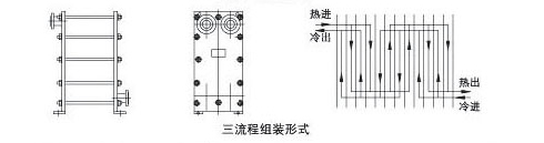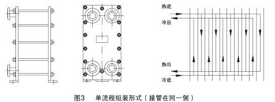 板式換熱器根據(jù)介質(zhì)的溫差和流量,可以裝配成單流程、雙流程、三流程以及多流程的形式,單流程是指介質(zhì)在換熱器內(nèi)流過一個流程,雙流程是指介質(zhì)在換熱器內(nèi)折返流過兩個過程,依次類推,各種流程的外形圖和其流程示意圖如圖三。單流程時接口可以都在前面的夾緊板上,也可以不都在前面的夾緊板上,當(dāng)采用多流程時,換熱器的四個接口就不能在同一側(cè)的夾緊板上,進(jìn)出口要位于前后兩個夾緊板上。