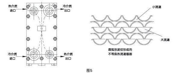 BRB 型的特點(diǎn)是,采用兩種不同的換熱板片和膠墊(俗稱 A 板 A 墊和 B 板 B 墊)。板片對角方位上是兩個大流道孔,另外對角方位是兩個小流道孔,同種介質(zhì)在對角流道孔進(jìn)出,不能在同側(cè)流道孔進(jìn)出,如圖5。板片波紋截面形狀為圓弧形,兩種板片的圓弧形狀方向相反,裝配時兩種板片交替疊放,裝配后,由于兩種板片波紋截面弧狀彼此相反,對應(yīng)大流道孔的板片波紋是圓弧里面相對,內(nèi)腔形成較大的流道截面;而對應(yīng)小流道孔的板片波紋是圓弧的背面,內(nèi)腔形成小的流道截面,兩截面面積的比例大致為2:1,這就是 BRB 型不等流道截面的由來。