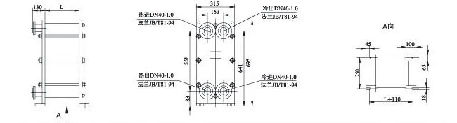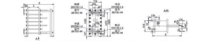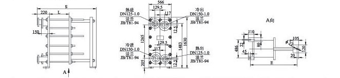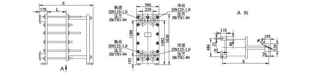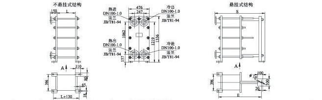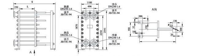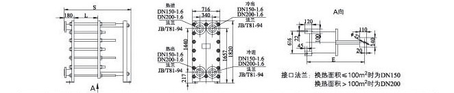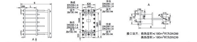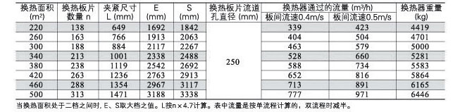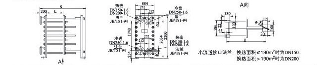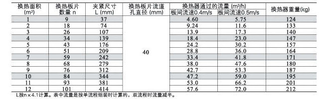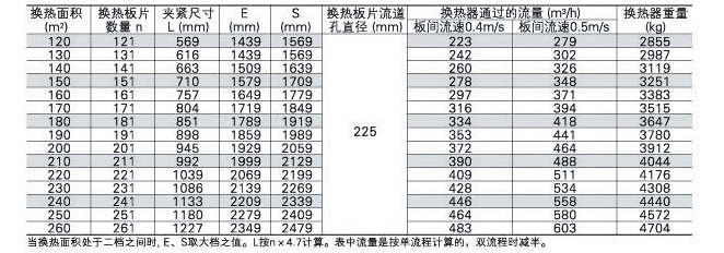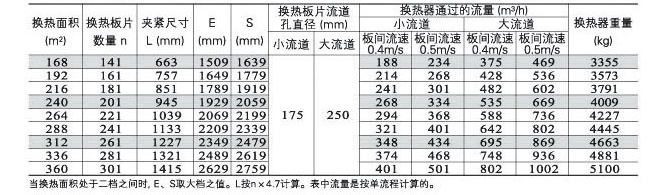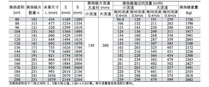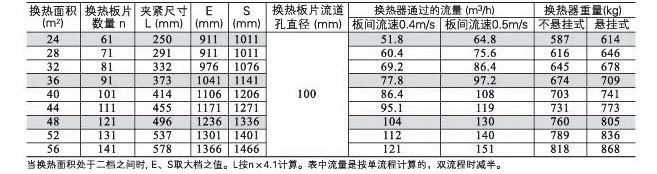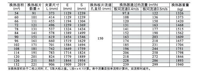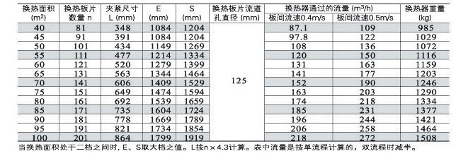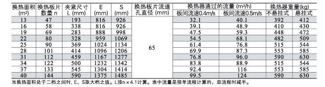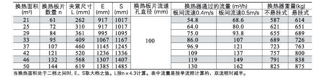 由于不同時期的產(chǎn)品參數(shù)可能有變化,因此下面參數(shù)表中的數(shù)據(jù)僅供參考。圖中接口法蘭大小為常規(guī)規(guī)格,如果流量較小時可以減少,但一般不能加大。表中都是以單流程組裝形式為例,也可裝成多流程形式。換熱面積也可以不按表中格擋數(shù)值而任意選取,當(dāng)換熱面積位于表中二檔之間時,懸掛式的E、S尺寸要按下一檔的大檔之值確定,L尺寸要按表下面的算式算出。